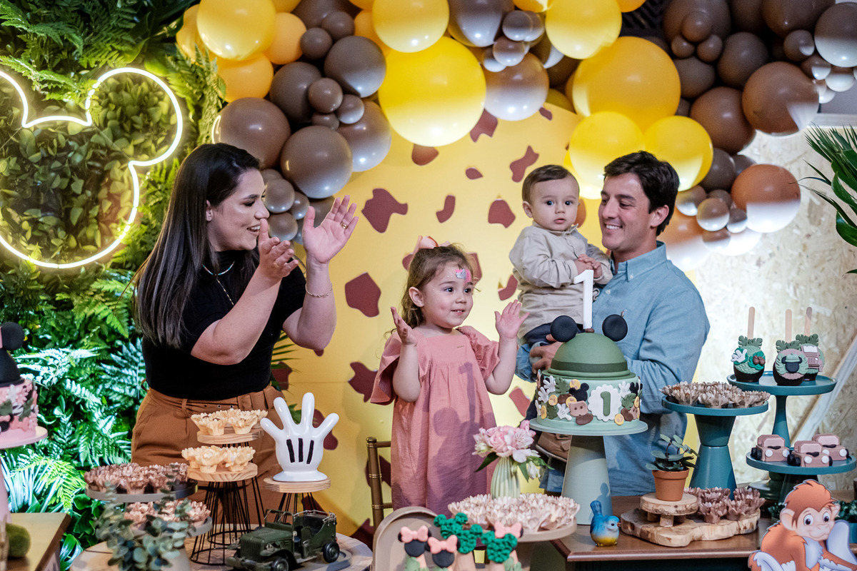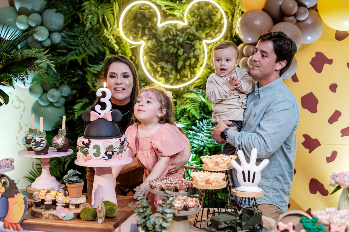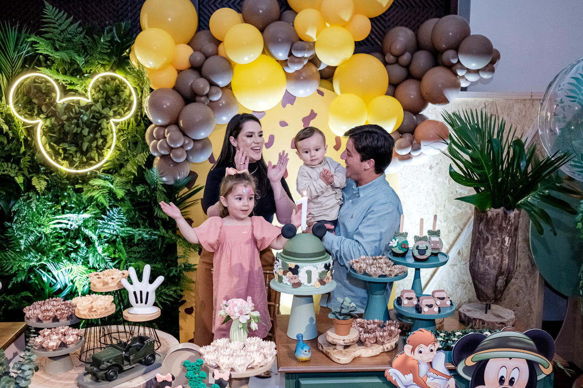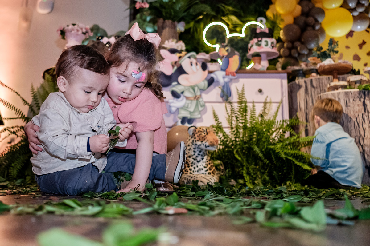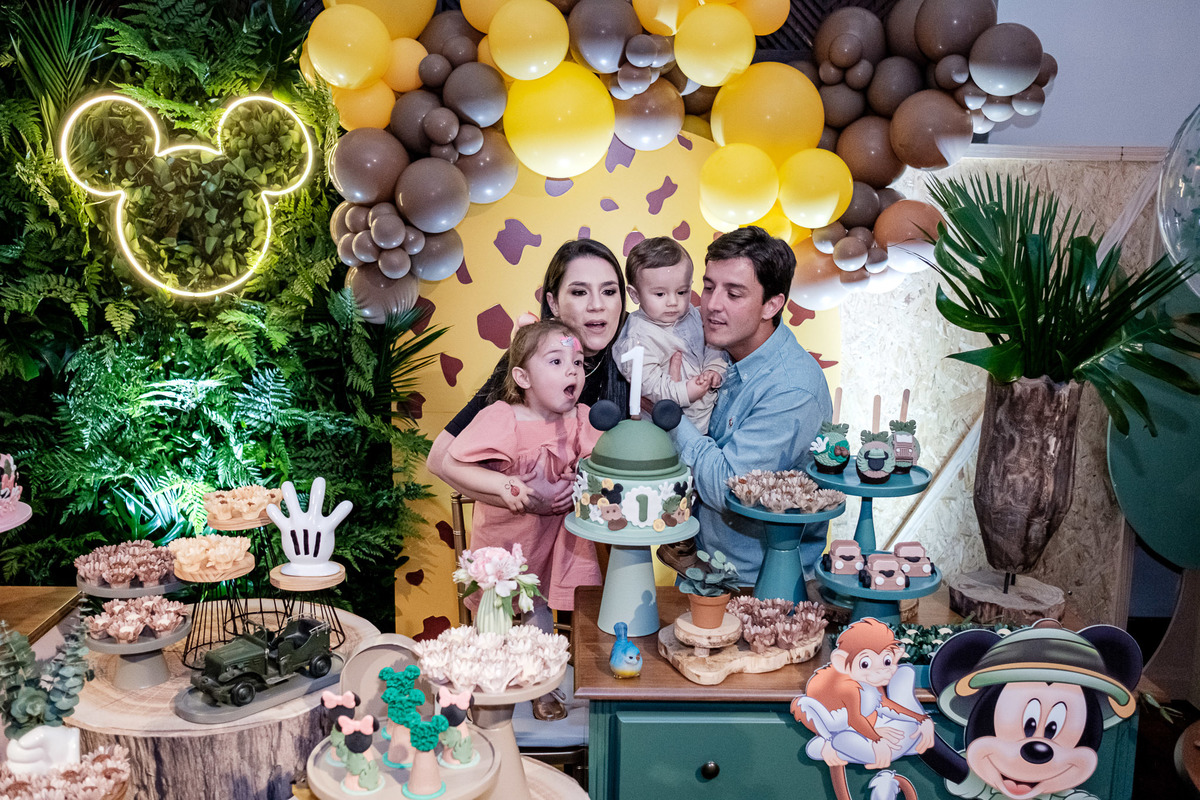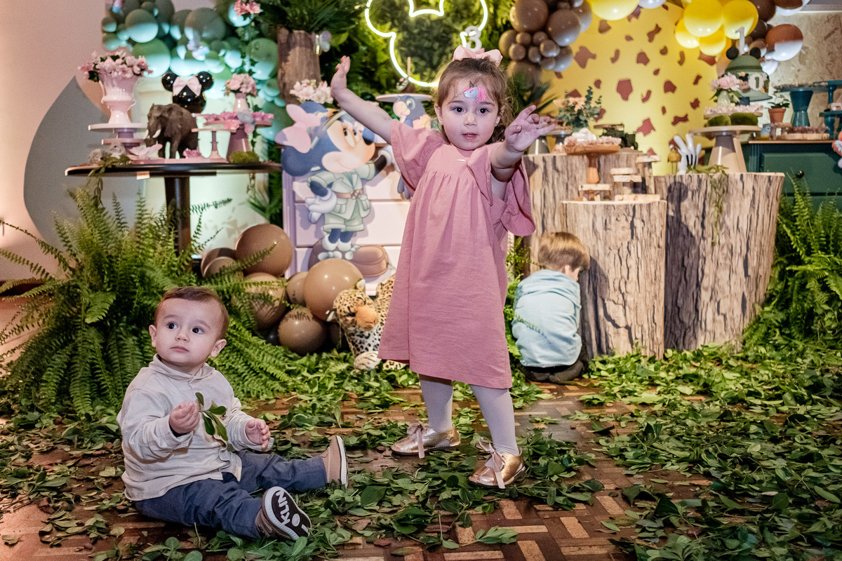 Quando chegaram ao salão de festas, Marina e Joaquim se depararam com um cenário incrível, repleto de animais selvagens, árvores e até mesmo a presença dos seus personagens favoritos, Mickey e Minnie. Marina e Joaquim se divertiram muito brincando, explorando o safari e tirando fotos com seus personagens favoritos.