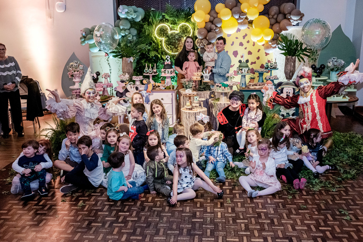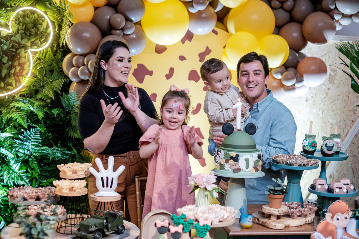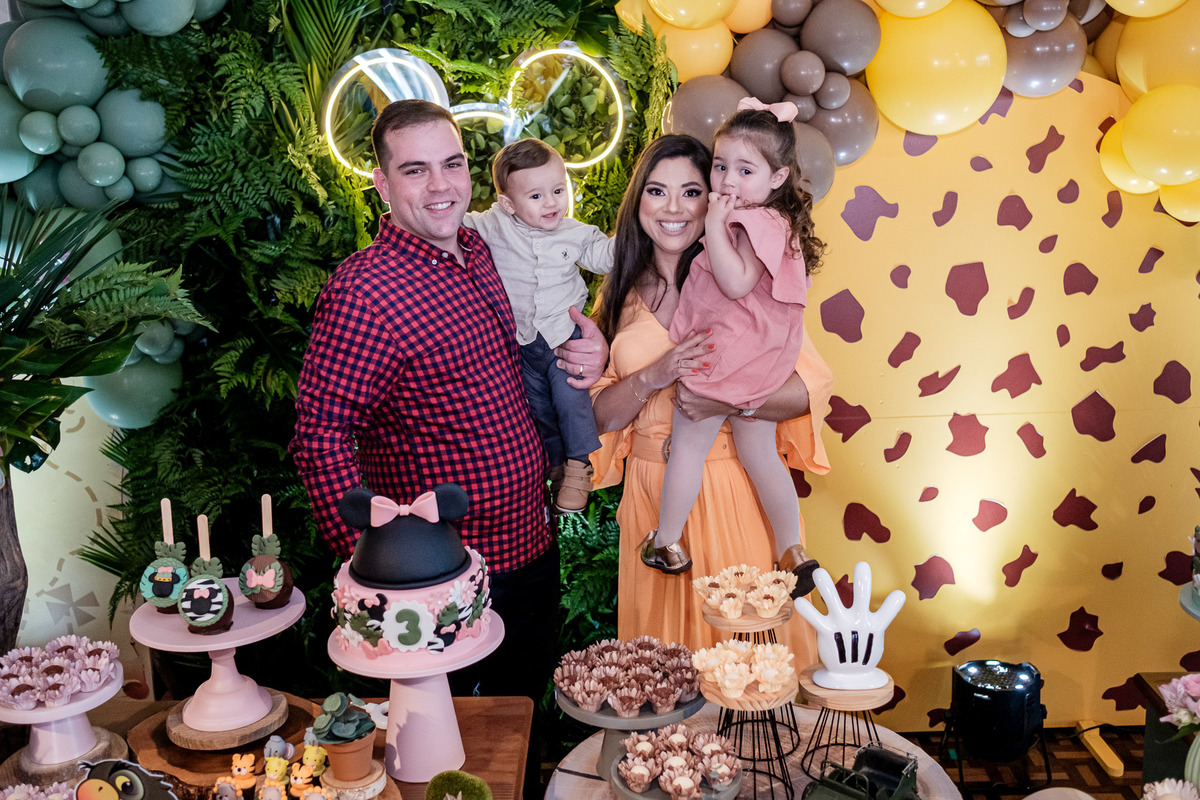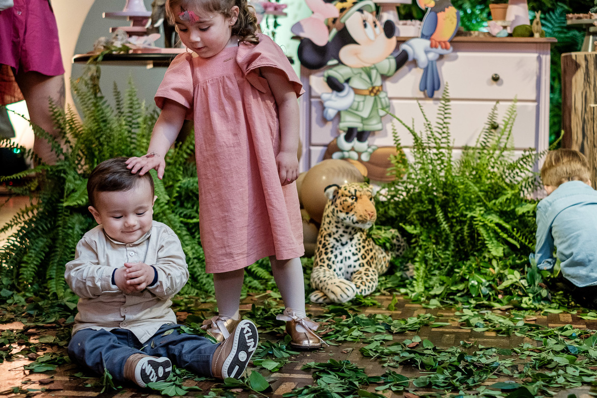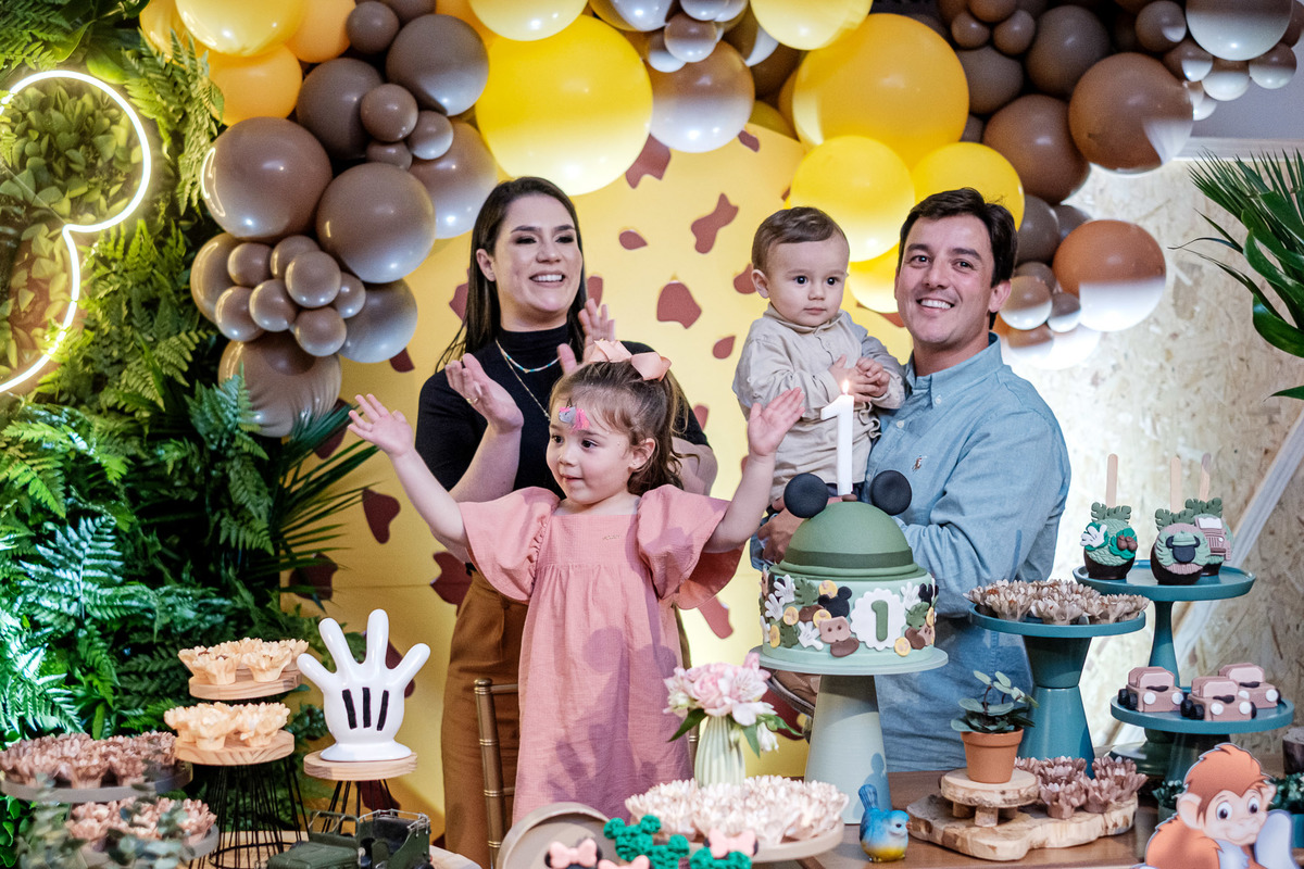 Quando chegaram ao salão de festas, Marina e Joaquim se depararam com um cenário incrível, repleto de animais selvagens, árvores e até mesmo a presença dos seus personagens favoritos, Mickey e Minnie. Marina e Joaquim se divertiram muito brincando, explorando o safari e tirando fotos com seus personagens favoritos.