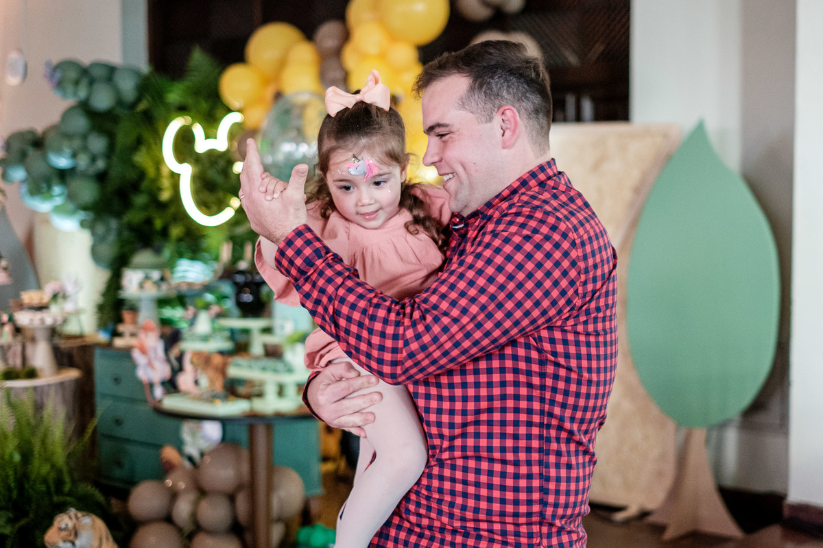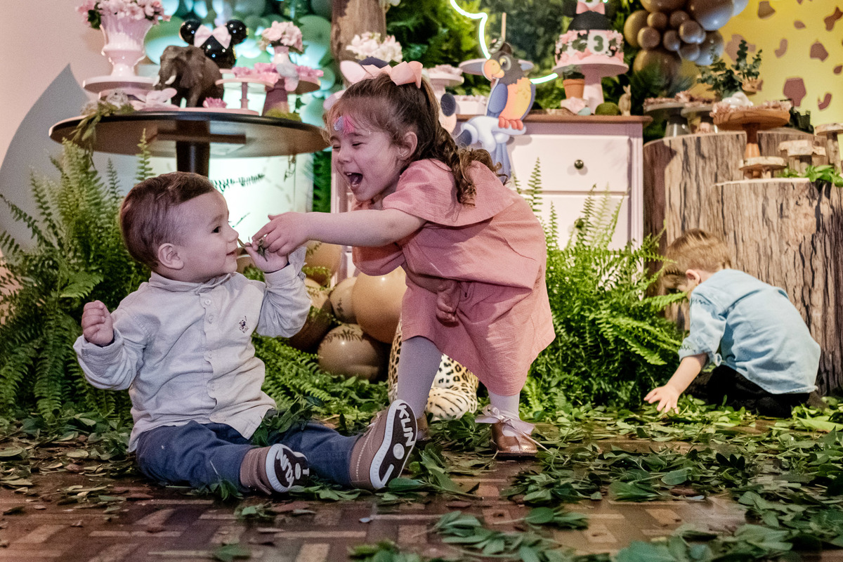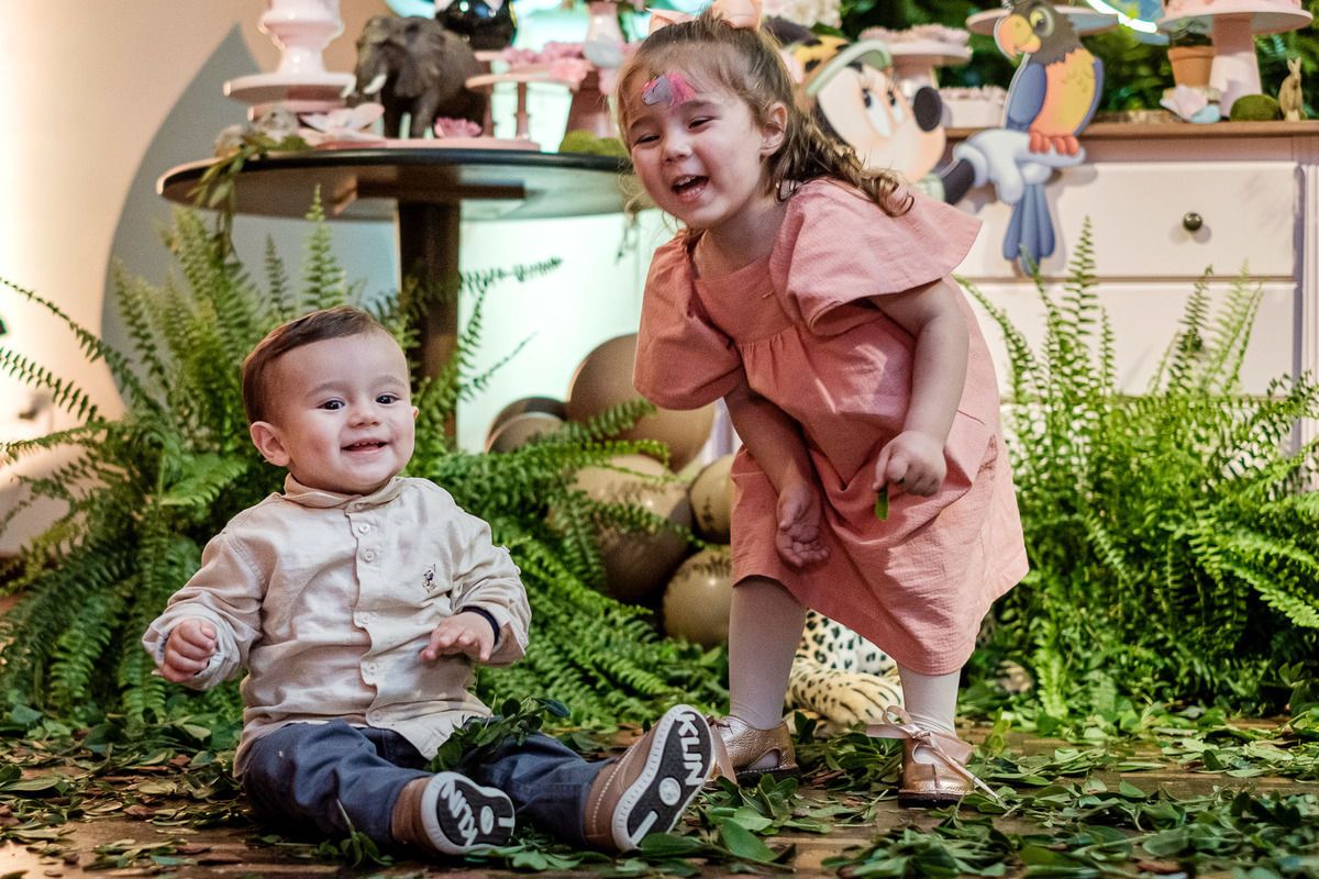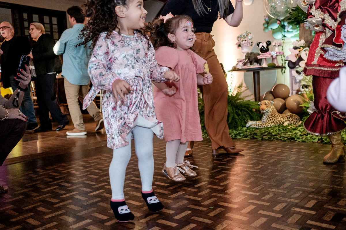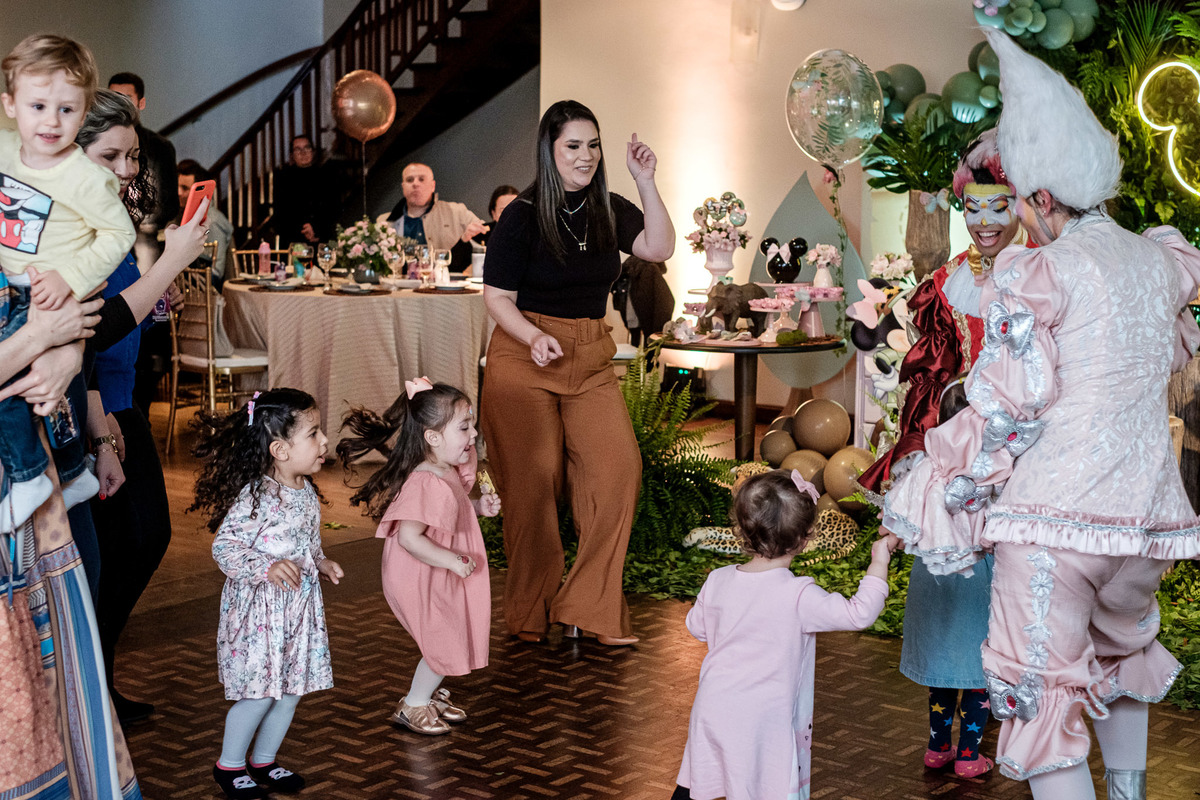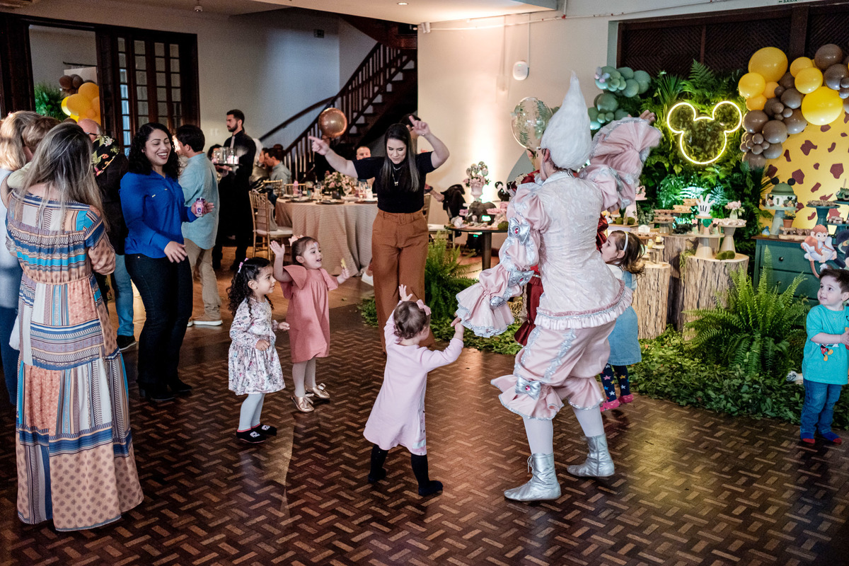 Quando chegaram ao salão de festas, Marina e Joaquim se depararam com um cenário incrível, repleto de animais selvagens, árvores e até mesmo a presença dos seus personagens favoritos, Mickey e Minnie. Marina e Joaquim se divertiram muito brincando, explorando o safari e tirando fotos com seus personagens favoritos.
